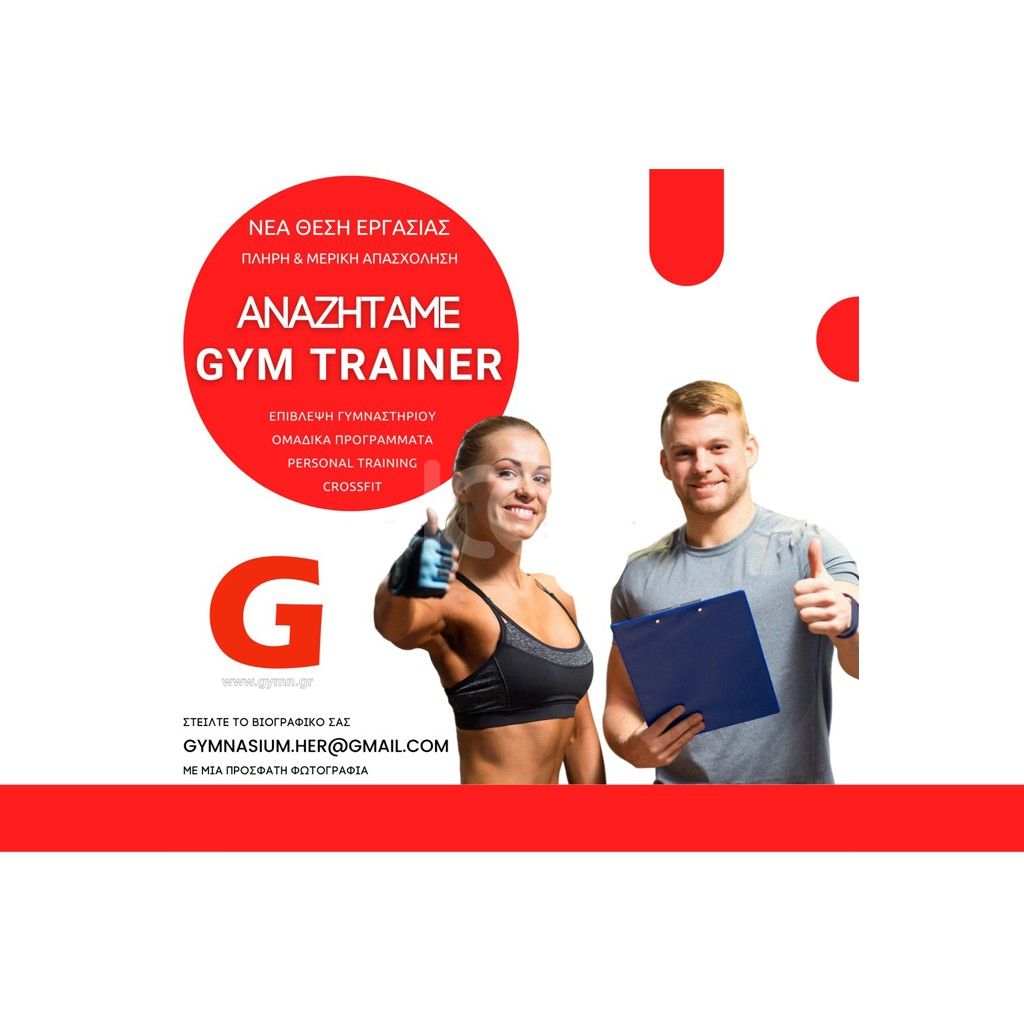 ζητείται για χώρο άθλησης-γυμναστήριο, με αρμοδιότητες επίβλεψη fitness, ομαδικά προγράμματα και personal training με μερικό ή πλήρες ωράριο.