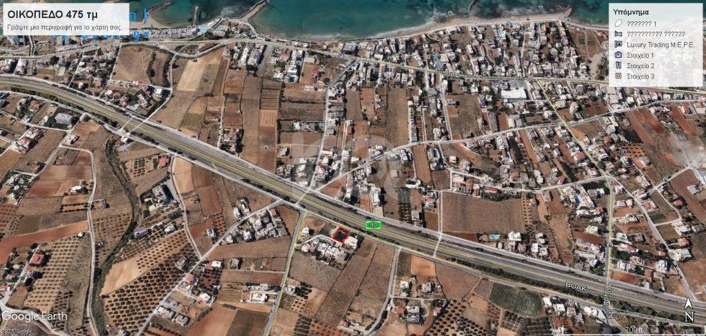 οικόπεδο, εντός σχεδίου, 450τμ, δόμηση 240 τμ+40 πατάρι, ΣΚ 0.60, πρόσοψη 18μ., απόσταση από θάλασσα 450μ., περιέχει ελιές, επίπεδο, θέα θάλασσα, άρτιο, οικοδομήσιμο, περίφραξη, μεσίτες δεκτοί