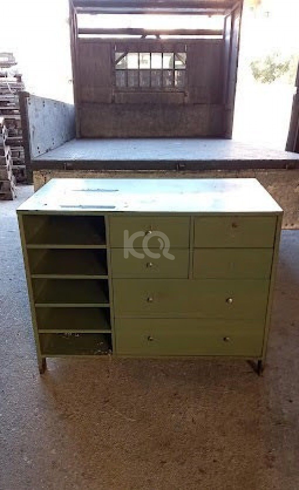 μεταχειρισμένο, από ξύλινη στιβαρή κατασκευή, με ράφια και έξι συρτάρια, σε απαλό πράσινο. Είναι ειδική κατασκευή για σημεία πώλησης - εξυπηρέτησης πελατών.