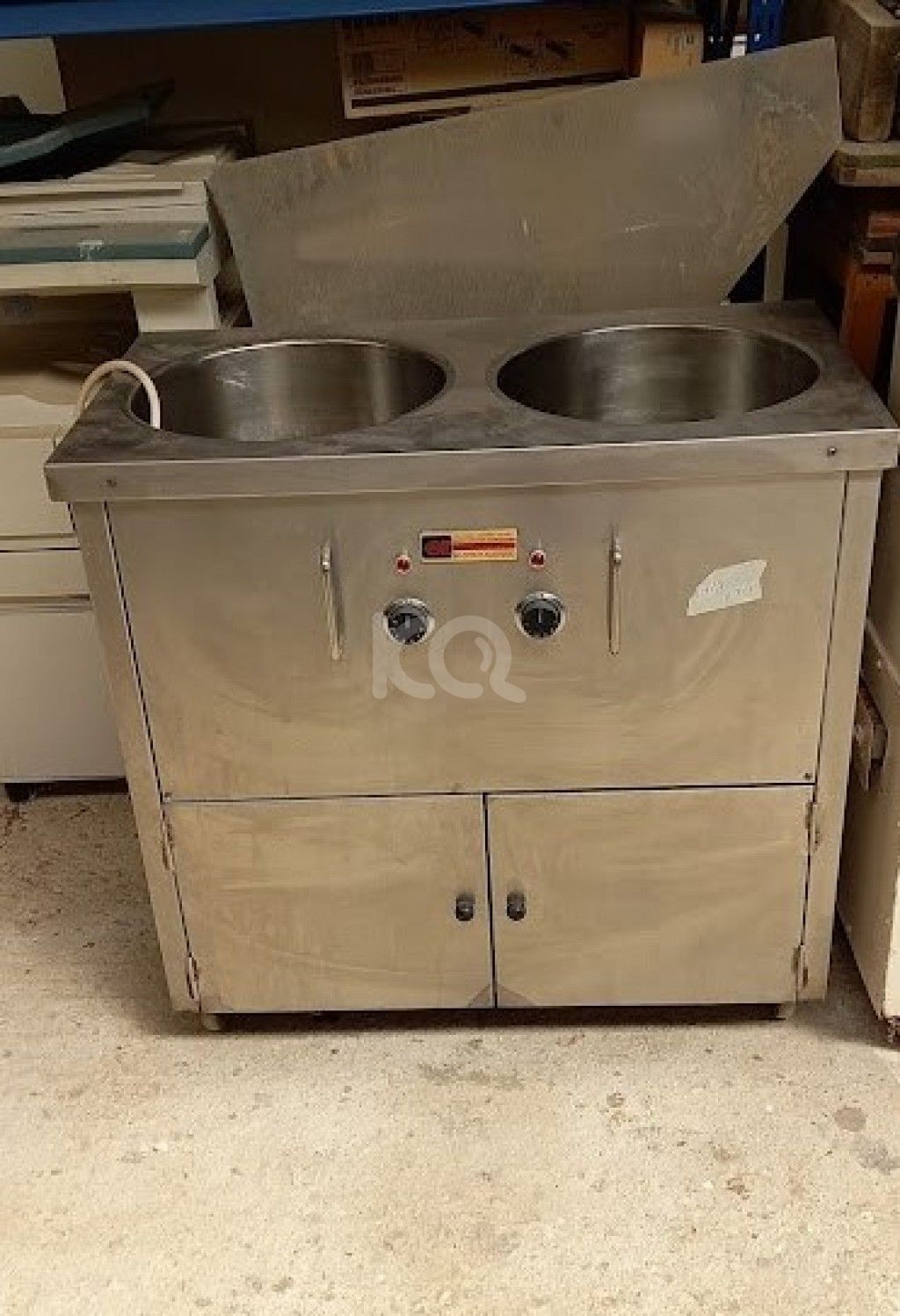 Μεταχειρισμένο, ανοξείδωτο μπαίν μαρί ζαχαροπλαστικής, με 2 κάδους διάστασης: Φ38 και βάθος 38εκ, 2 ξεχωριστούς θερμοστάτες και χώρο αποθήκευσης. Σε καλή κατάσταση. Διαστάσεις: 90X50X88.