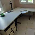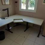 μεταχειρισμένο, μελαμίνης, με μεταλλικά πόδια και συρταριέρα, σε λευκό χρώμα. Σε καλή κατάσταση. Διαστάσεις: 200μ και 240x 80x75εκ.