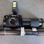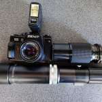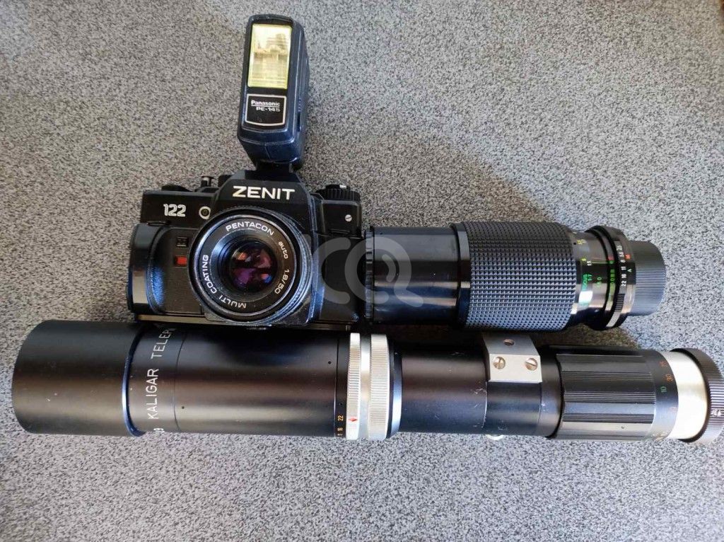 Zenit 122 με φακό Pentacon α)1:8 f=50, β)Kaligar Telephoto 1:5.6 f=300mm, γ)Minordi Zoom MC 1:4.5 f=80-200mm και φλας Panasonic.