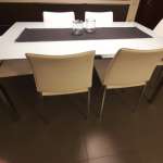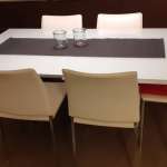 διαστάσεων 90x1,60 (με προέκταση που φτάνει μέχρι 2,30) με 6 δερμάτινες καρέκλες σε άριστη κατάσταση (σκελετός inox)