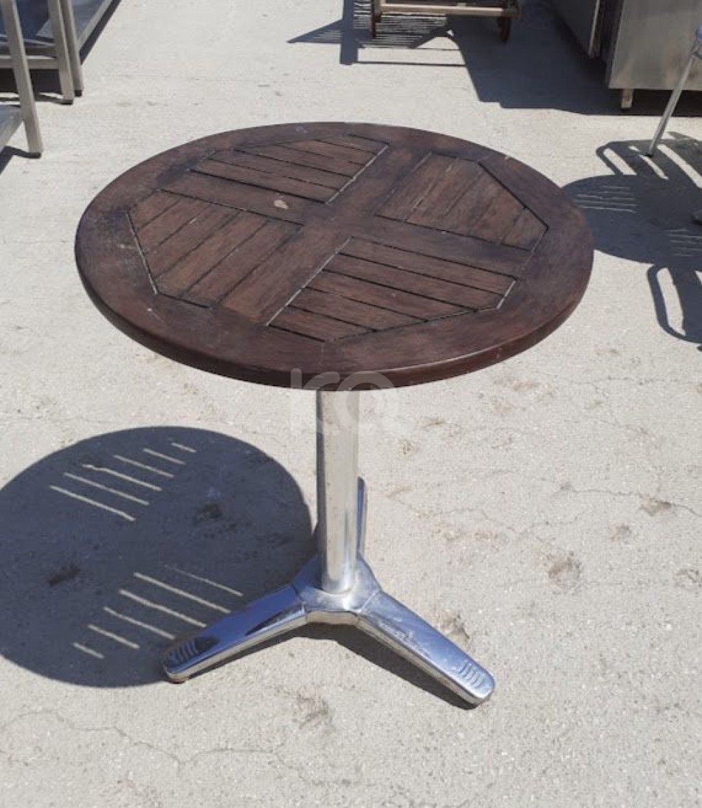 Μεταχειρισμένο τραπέζι εσωτερικού και εξωτερικού χώρου, με βάση αλουμινίου και ξύλινο καπάκι. Σε καλή κατάσταση. Φ60εκ, Υ72εκ. Τιμή: 25€/τμχ. Η τιμή δεν περιλαμβάνει φπα 24% και μεταφορικά.