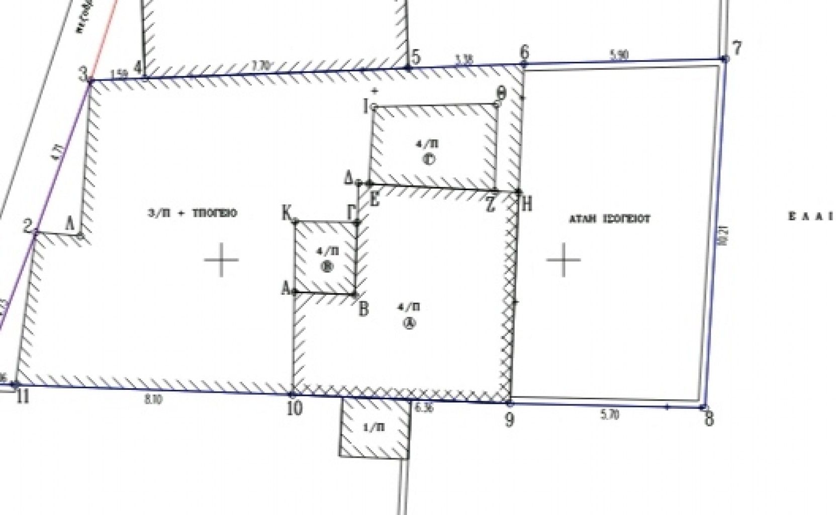 Αποτελείται από 1 υπόγειο 126τ.μ μερικώς διαρρυθμισμένο, στο ισόγειο από ένα μαγαζί 35τ.μ, 1 δυάρι 40τ.μ. και αυλή 70τ.μ. στη πίσω μεριά. Στο 1ο όροφο από 1 δίχωρη γκαρσονιέρα 40τ.μ και 2 μονόχωρες 30τ.μ. και μπαλκόνια σε κάθε γκαρσονιέρα. Στο 2ο όροφο από 1 τεσσάρι οροφοδιαμέρισμα 120τ.μ με μπαλκόνι και στο 3ο όροφο ταράτσα με 1 δώμα 34τ.μ.