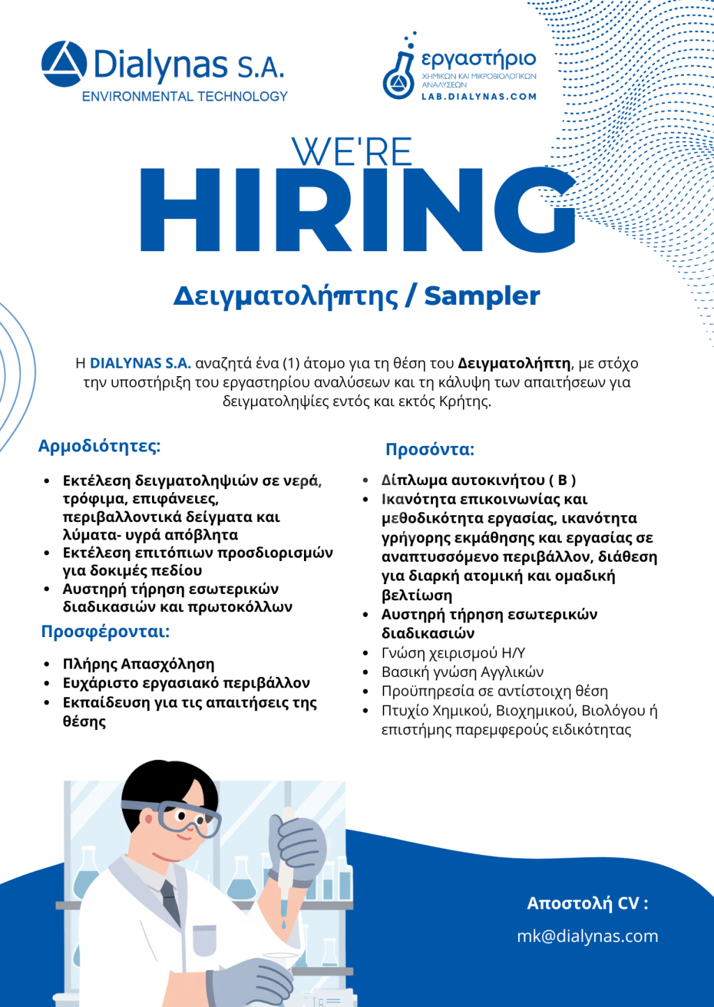Διαπιστευμένο Εργαστήριο Χημικών & Μικροβιολογικών Αναλύσεων με έδρα το Ηράκλειο Κρήτης, επιθυμεί να προσλάβει άμεσα ένα (1) άτομο για τη θέση του Δειγματολήπτη.