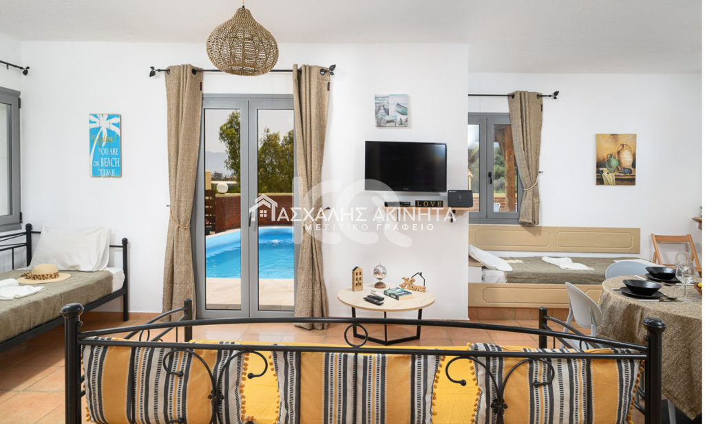 Ανακαινισμένη διαμπερής και προσόψεως, επιπλωμένη και ηλεκτρικά εξοπλισμένη μονοκατοικία, ισογείου 85 τ.μ. Διαθέτει ενιαίο χώρο σαλόνι-κουζίνα, 3 υ/δ, 1 λουτρό με ντουζιέρα και 1 wc, τζάκι, κλιματισμό, ηλιακό θερμοσίφωνο, μετρητή ΔΕΗ, βεράντα, ιντερνετ, πόρτα ασφαλείας, αυλή, κήπο, υπόγειο, αποθήκη, πάρκινγκ, απεριόριστη θέα βουνό και θάλασσσα, ημιυπαίθριοι χώροι, πισίνα. Δεκτά κατοικίδια. ΠΕΑ Β. Διαθέσιμο μόνο για βραχυχρόνια μίσθωση. Τιμή ενοικίου 600 ευρώ.