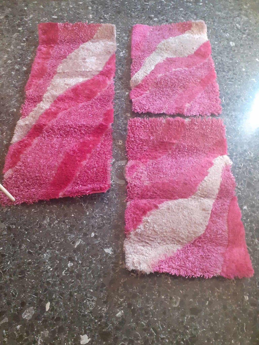 3 ροζ ασορτί διάδρομοι σε πολύ καλή κατάσταση. Διαστάσεις: οι δύο 1,05μ. επί 0,70μ. και ο άλλος 1,75μ. επί 0,70μ. Τιμή: 10 ευρώ ο καθένας. Όλοι μαζί 25 ευρώ