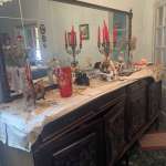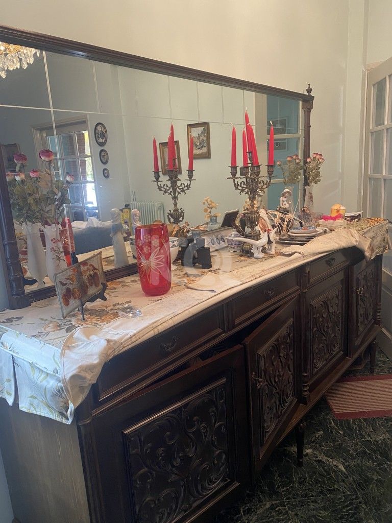 Τραπέζι με 6 καρέκλες, βιτρίνα, και μπουφές με καθρέπτη.
