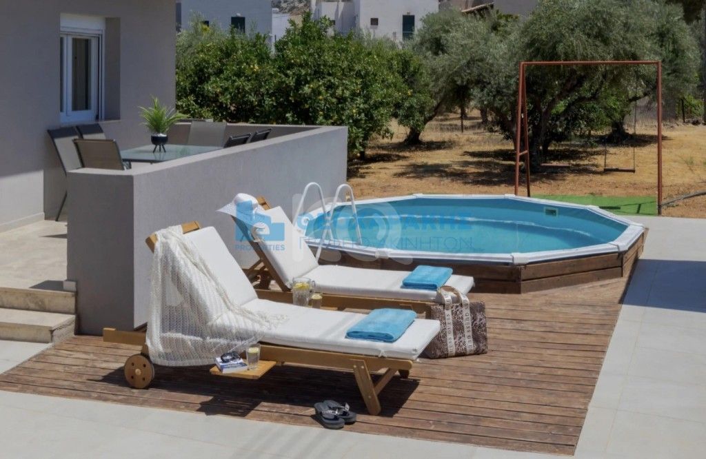 Η κατοικία βρίσκεται σε οικόπεδο 1000 τ.μ., με μεγάλο κήπο, πισίνα με ντουζιέρα και θέση στάθμευσης. Η είσοδος στο ακίνητο γίνεται μέσω ηλεκτρικής γκαραζόπορτας.