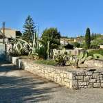 Μεγάλος ιδιωτικός κήπος με δέντρα, λουλούδια, κάκτους, βεράντα, αυλή.