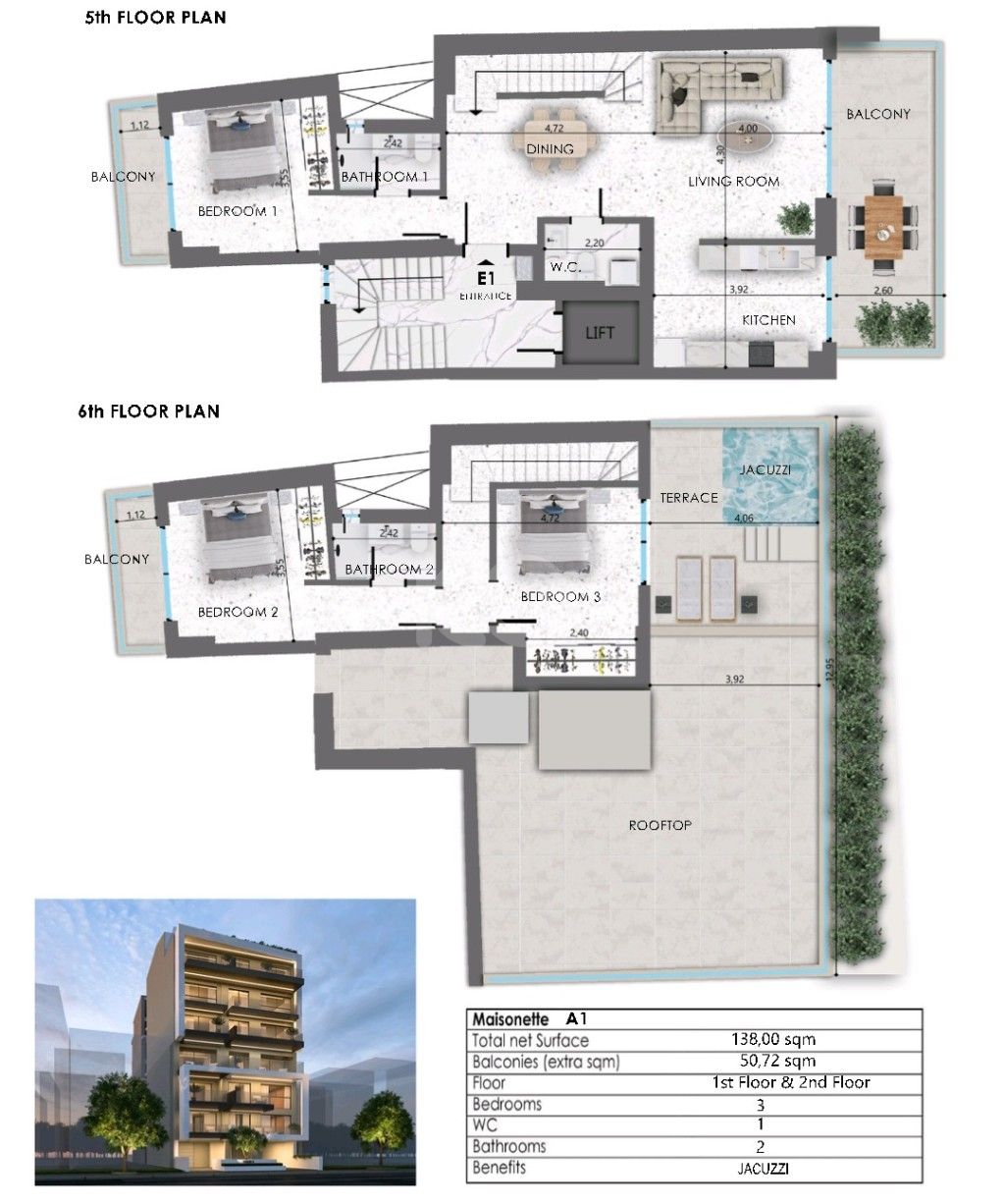 Πρόκειται για κατοικία πέμπτου - έκτου ορόφου συνολικής επιφάνειας 138τ.μ., ενεργειακής κλάσης Α+, προσφέροντας στον ιδιοκτήτη υψηλή αισθητική και μέγιστη εξοικονόμηση ενέργειας. Η μεζονέτα αποτελείται από 3 υπνοδωμάτια, ευρύχωρο σαλόνι, κουζίνα, τραπεζαρία, 2 μπάνια, 1w/c, πατάρι, αποθήκη, τζακούζι, μπαλκόνια με γυάλινα κάγκελα, καθώς και 1 υπόγεια θέση στάθμευσης.