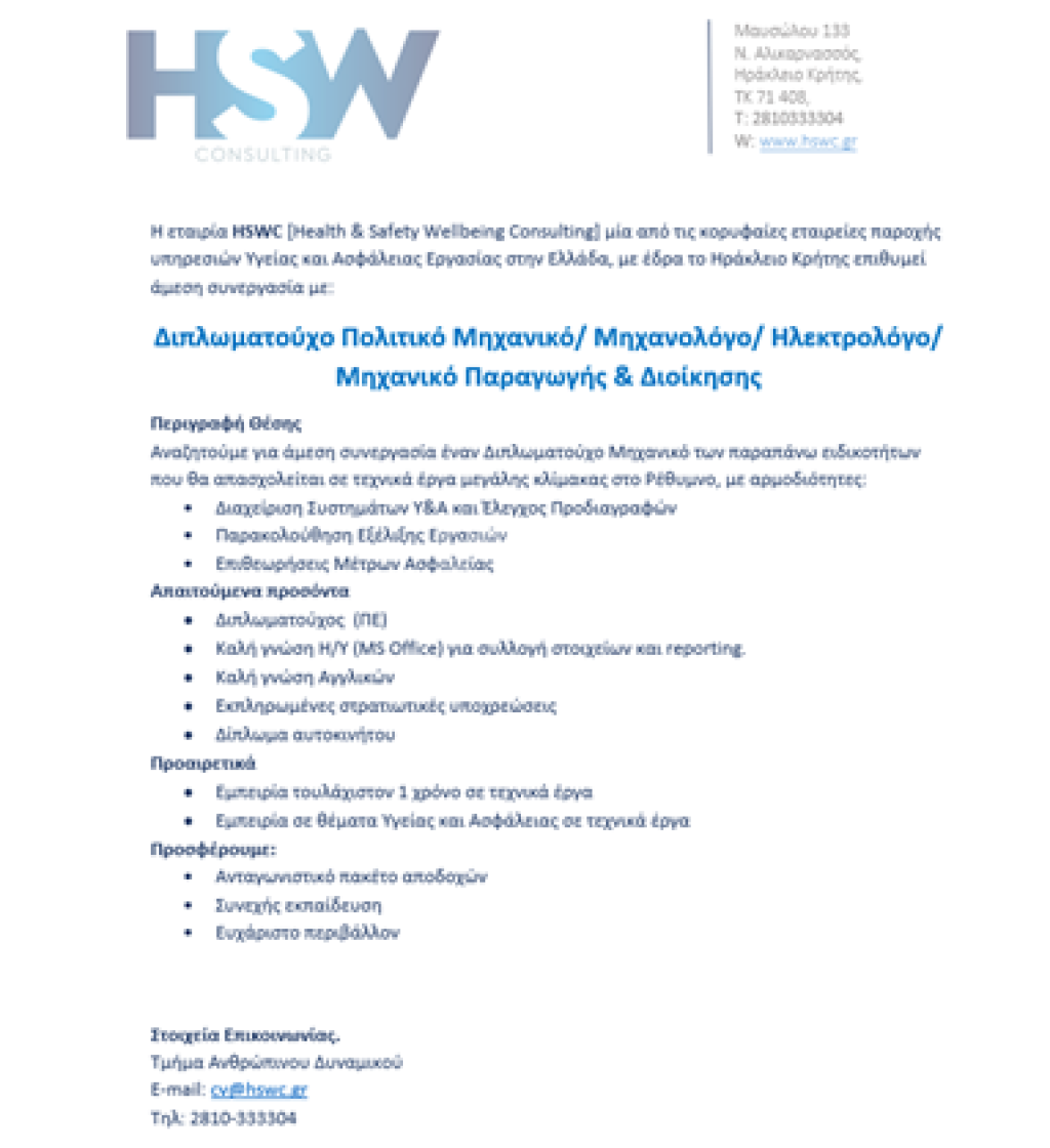 Η εταιρία HSWC μία από τις κορυφαίες εταιρείες παροχής υπηρεσιών Υγείας και Ασφάλειας στην Εργασία στην Ελλάδα, με έδρα το Ηράκλειο Κρήτης επιθυμεί άμεση συνεργασία με Διπλωματούχο Πολιτικό Μηχανικό/ Μηχανολόγο/ Ηλεκτρολόγο/ Μηχανικό Παραγωγής & Διοίκησης (ΠΕ) που θα απασχολείται σε τεχνικά έργα μεγάλης κλίμακας.