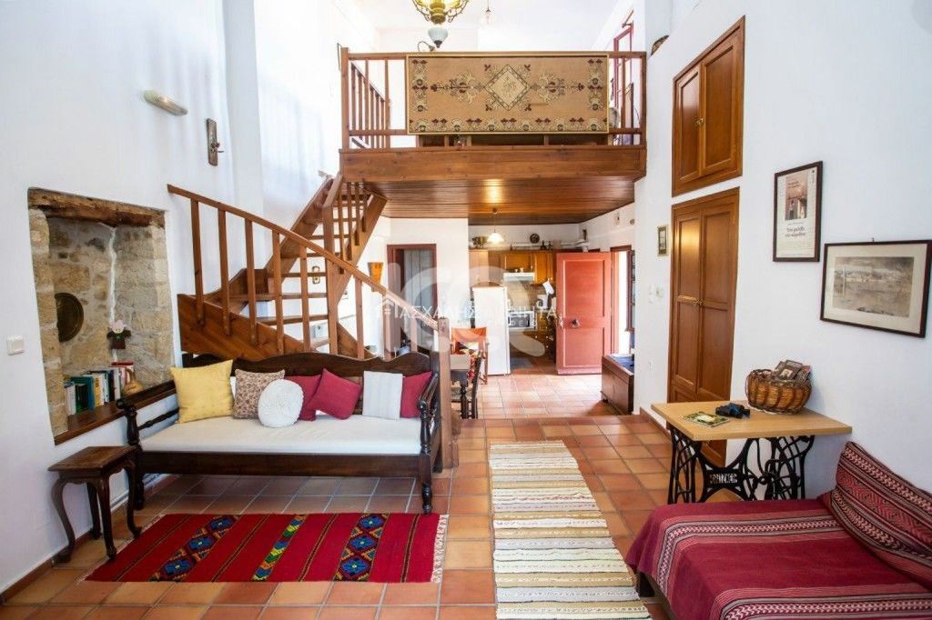 Furnished and electrically equipped (and with a washing machine) detached house-maisonette of 2 levels 75 sq.m. It has a single living-kitchen area, 1 bedroom, 1 bathroom and 2 wc, fireplace, air conditioning, solar, autonomous PPC clock (night current) balcony, courtyard with garden, mountain-sea view, interner. Small pet accepted. PEA D. Rent price 650 euros.