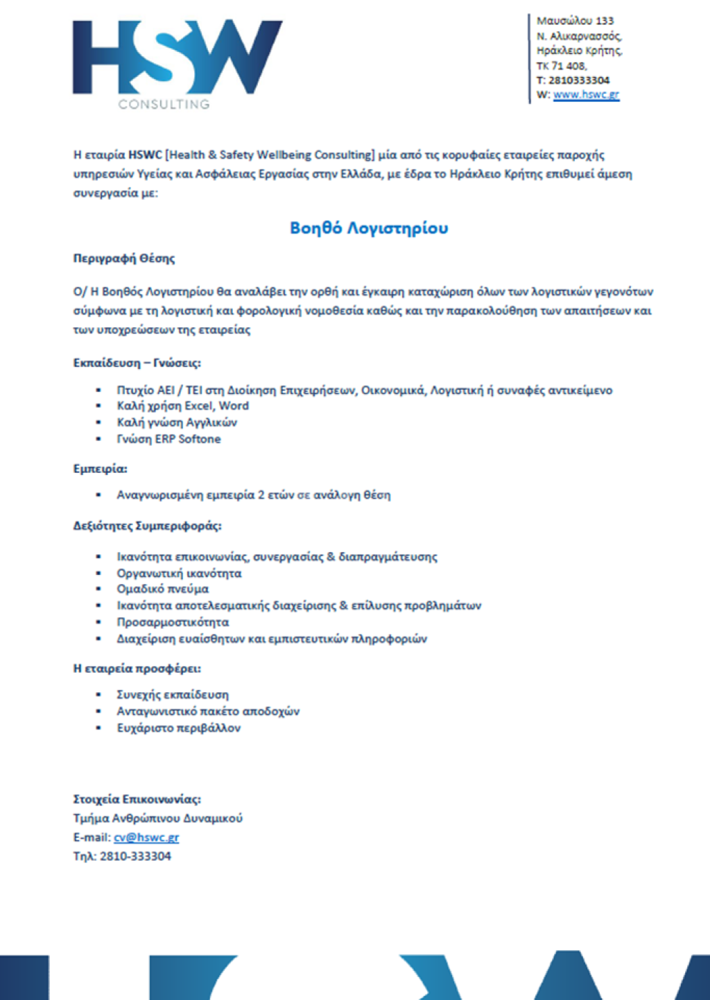 Η εταιρία HSWC μία από τις κορυφαίες εταιρείες παροχής υπηρεσιών Υγείας και Ασφάλειας στην Εργασία στην Ελλάδα, με έδρα το Ηράκλειο Κρήτης αναζητά Βοηθό Λογιστηρίου, ο οποίος θα αναλάβει την ορθή και έγκαιρη καταχώριση όλων των λογιστικών γεγονότων και την παρακολούθηση των απαιτήσεων & των υποχρεώσεων της εταιρείας.