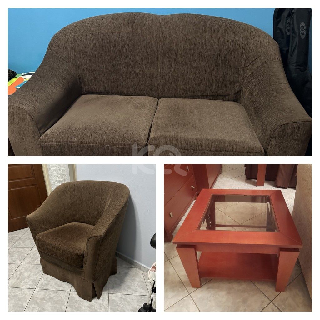 Καναπές διθέσιος, πολυθρόνα και τραπεζάκι σαν καινούρια. Είναι ξύλο όχι μελαμίνη.