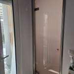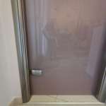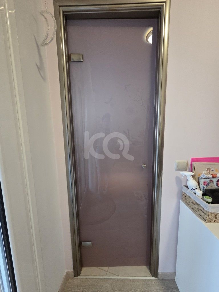 Τρίπλεξ πόρτα, χρώματος ροζ, με διπλό τζάμι, μαζί με το κασελίκι αλουμινίου.