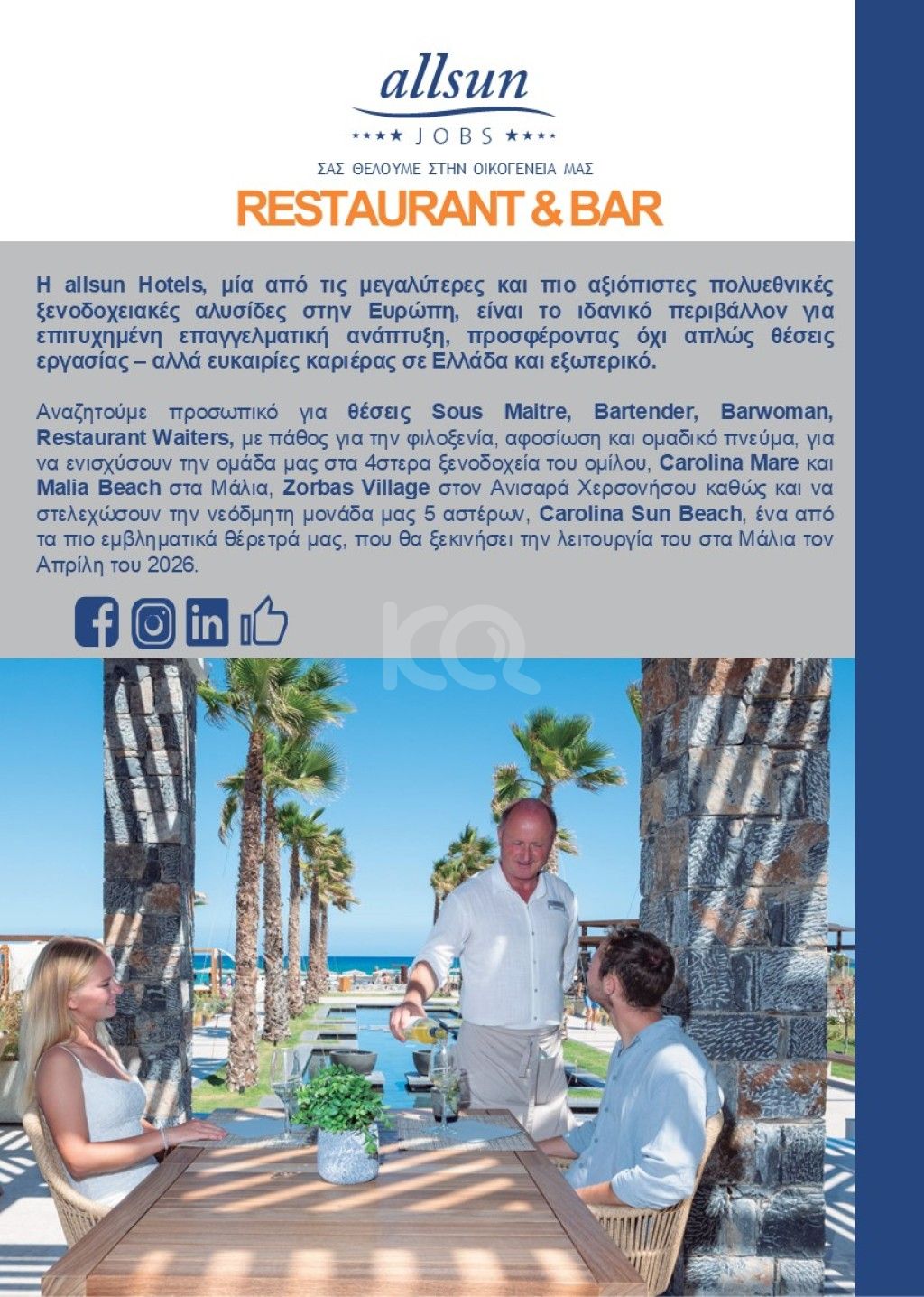 Αναζητούμε Σερβιτόρους/ες με πάθος για τη φιλοξενία , αφοσίωση και ομαδικό πνεύμα, για να ενισχύσουν την ομάδα μας.