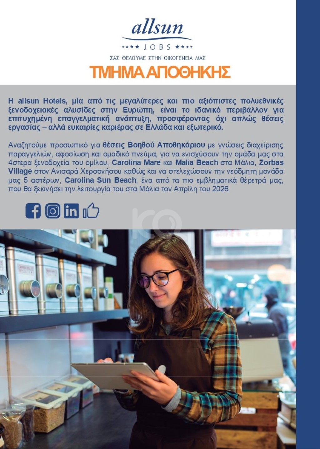 Αναζητούμε βοηθό αποθηκάριου με γνώσεις διαχείρισης παραγγελιών, αφοσίωση και ομαδικό πνεύμα, για να ενισχύσουν την ομάδα μας.