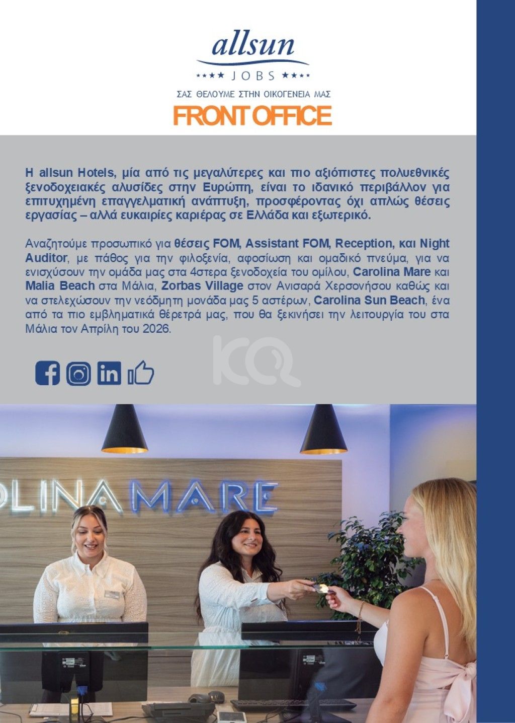 Αναζητούμε Front Office Manager με πάθος για την φιλοξενία, αφοσίωση και ομαδικό πνεύμα, να ενισχύσουν την ομάδα μας.