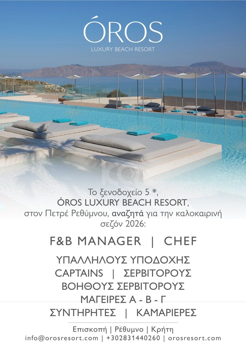 Προσωπικό ζητείται για τη σεζόν 2026, από ξενοδοχείο 5* στο Ρέθυμνο.