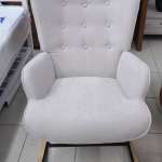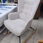 Καινούργια κουνιστή πολυθρόνα, με μεταλλικό σκελετό βάσης και δύο ξύλινα πόδια από rubberwood σε φυσικό χρώμα. Ύφασμα ανοιχτό γκρι χρώμα. Διαστάσεις: 75x71x95 εκ.