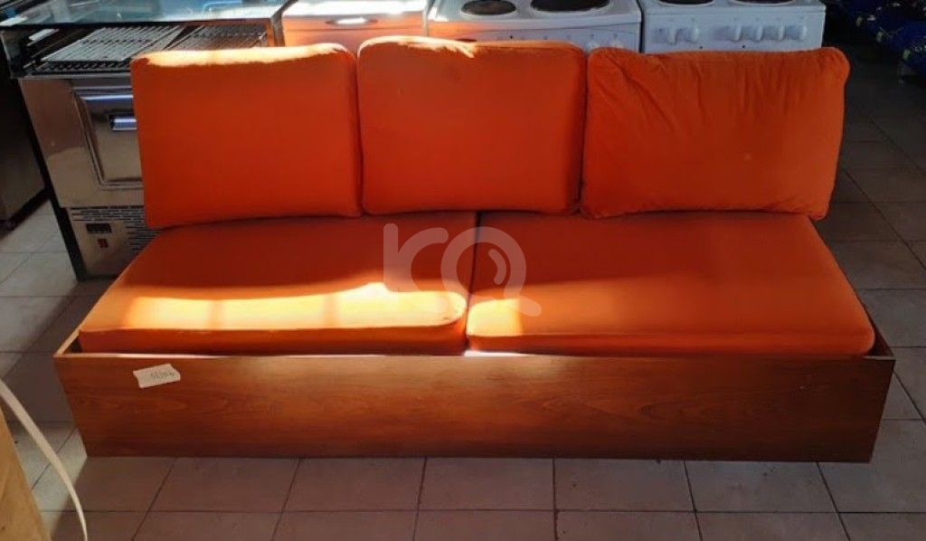 Μεταχειρισμένος τριθέσιος καναπές με ξύλινη βάση και πορτοκαλί μαξιλάρια. Χωρίς πλάτη. Σε καλή κατάσταση. Διαστάσεις: 80x188εκ.