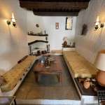 Inside, we find a living room with a fireplace, which creates a welcoming atmosphere, while small traditional corners have been formed around it, adorned with beautiful decorative elements and stone details. The bedroom has built-in beds, cleverly placed to leave free space and a sense of spaciousness. In the same spirit, the living room is equipped with built-in sofas, which are harmoniously integrated into the space.