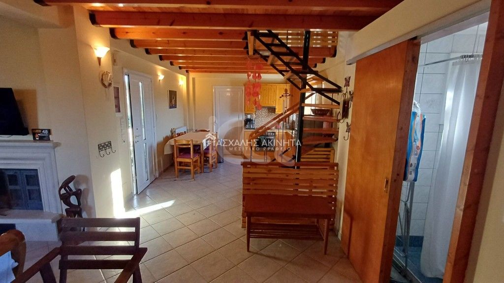 Fully furnished and electrically equipped detached house-maisonette on the ground floor, 2 levels 75 sq.m. on a fenced plot of 2 acres. It has a single living room-kitchen area, 1 large bedroom that can accommodate 2 large 2-side beds, 1 bathroom with shower, energy fireplace, air conditioning, solar and electric water heater, autonomous PPC clock, 2 large terraces, semi-outdoor areas with bbq and fruit trees. There is an additional plot of 1,200 sq.m. and possibility for an orchard. Pets accepted. PEA D. Rent price 650 euros.
