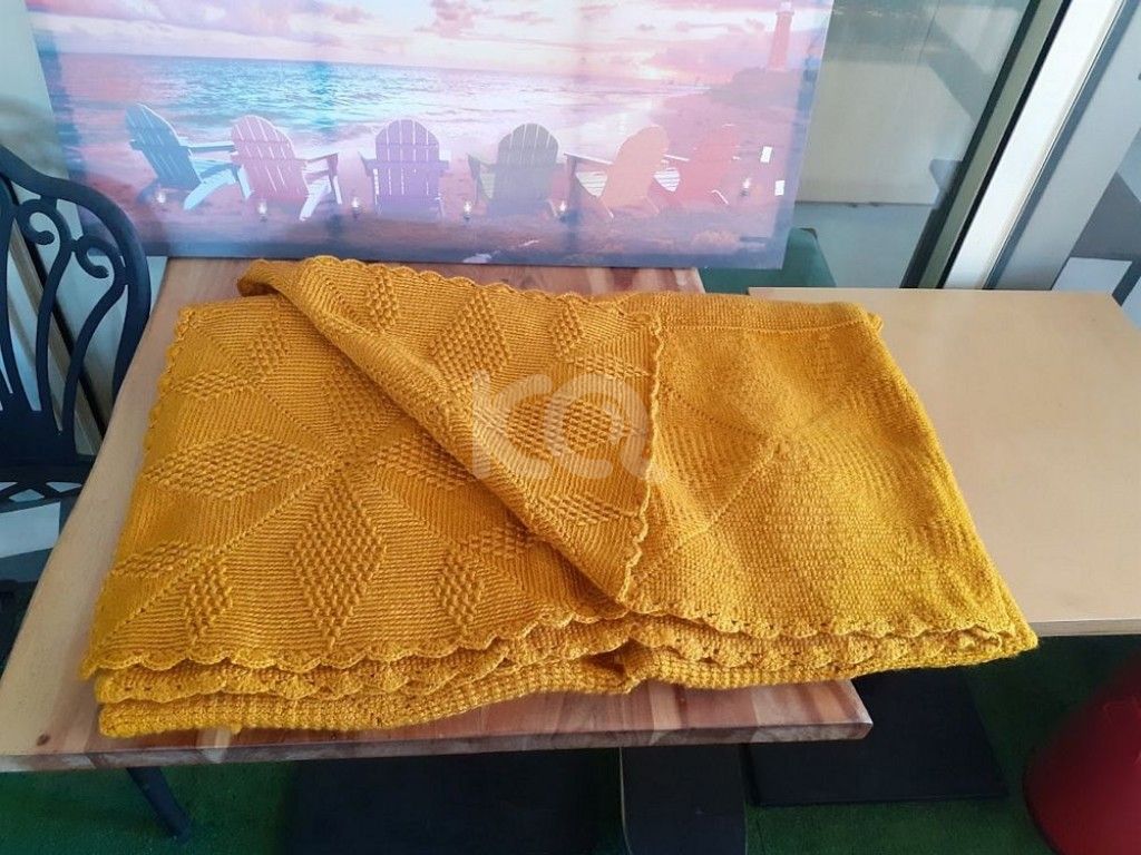 Μεταχειρισμένη, πλεκτή, χειροποίητη κουβέρτα, μάλλινη, σε μουσταρδί χρώμα. Διαστάσεις: 230x180εκ. Σε καλή κατάσταση.