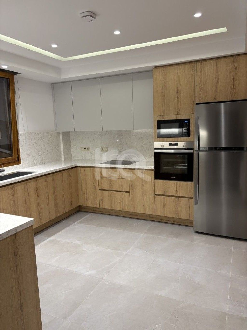 Η κουζίνα περιλαμβάνει όλες τις ηλεκτρικές συσκευές εντοιχισμένες και αρκετούς αποθηκευτικούς χώρους.