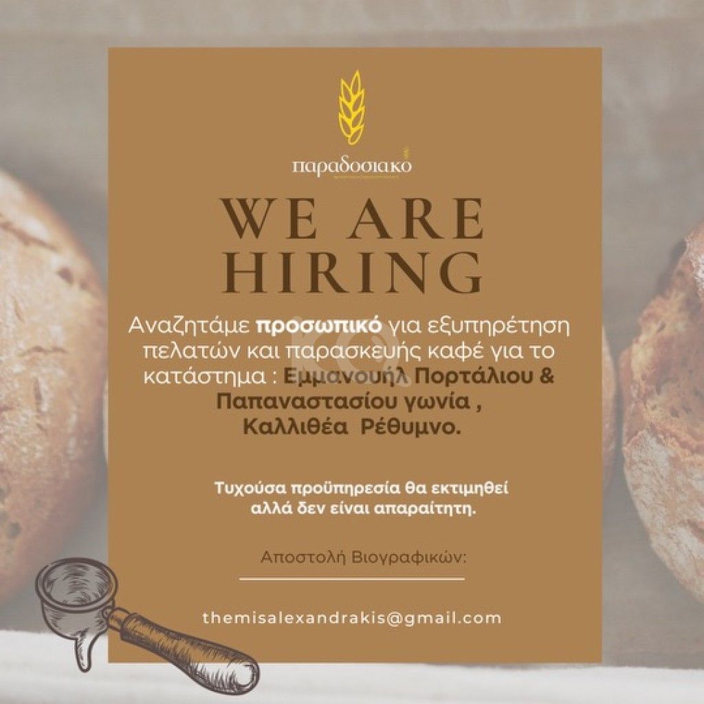 Αναζητάμε άτομα για την εξυπηρέτηση πελατών και την παρασκευή καφέ στο κατάστημα "Φούρνος Παραδοσιακό" Μάρκου Πορτάλιου και Παπαναστασίου Γωνία.
