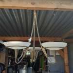 Μεταχειρισμένο κρεμαστό φωτιστικό οροφής με 3 γυάλινες καμπάνες και μεταλλικό σκελετό σε μπεζ χρώμα. Σε καλή κατάσταση. Η τιμή δεν περιλαμβάνει φπα 24% και μεταφορικά