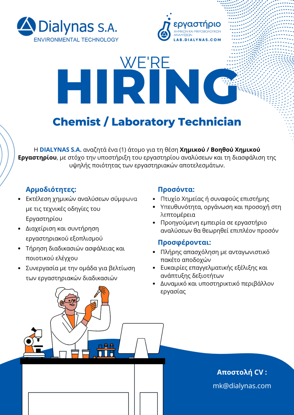 Αναζητείται ένα (1) άτομο για τη θέση Χημικού / Βοηθού Χημικού Εργαστηρίου, με στόχο την υποστήριξη εργαστηρίου αναλύσεων και τη διασφάλιση της υψηλής ποιότητας των εργαστηριακών αποτελεσμάτων σε αναλύσεις νερού, λυμάτων, τροφίμων.