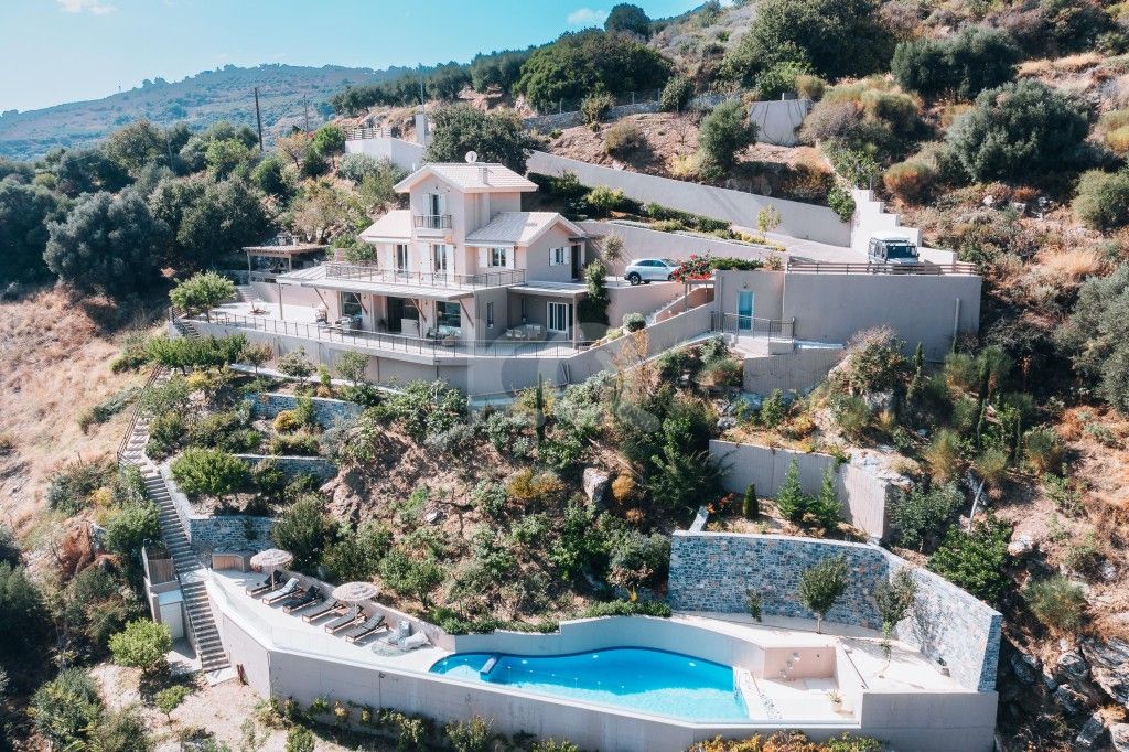 Μονοκατοικία - Βίλα τριών επιπέδων, 250τμ, σε οικόπεδο 2600τμ, κατασκευής 2007, με 4 υ/δ, 4 μπάνια, μεγάλο ενιαίο χώρο με τζάκι, χωριστό ξενώνα 40τμ, δωμάτιο υπηρεσίας 30τμ, μεγάλη αυλή, και εξωτερικούς χώρους με πέργκολα, ψησταριά, φούρνο, πισίνα 48τμ, και κήπο με δέντρα και λουλούδια της περιοχής. Όλοι οι χώροι είναι προσανατολισμένοι προς την θάλασσα και την πόλη και έχουν απέραντη και ανεμπόδιστη θέα. Διαθέτει πόρτα ασφαλείας, συναγερμό, κάμερα στην είσοδο, αυτόνομη θέρμανση και δροσισμό με αντλία θερμότητας, πλήρως επιπλωμένο και ηλεκτρικά εξοπλισμένο με όλη την οικοσκευή, 2 αποθήκες περίπου 15 και 20τμ, 3 θέσεις στάθμευσης σε ακάλυπτο χώρο. Η ποιότητα κατασκευής και η αισθητική είναι σε πολύ υψηλό επίπεδο αφού είχε φτιαχτεί για ιδιοκατοίκηση. Είναι κατάλληλο για τουριστική εκμετάλλευση, διαθέτει άδεια ΕΟΤ και ήδη είναι ενεργό σε πλατφόρμες.