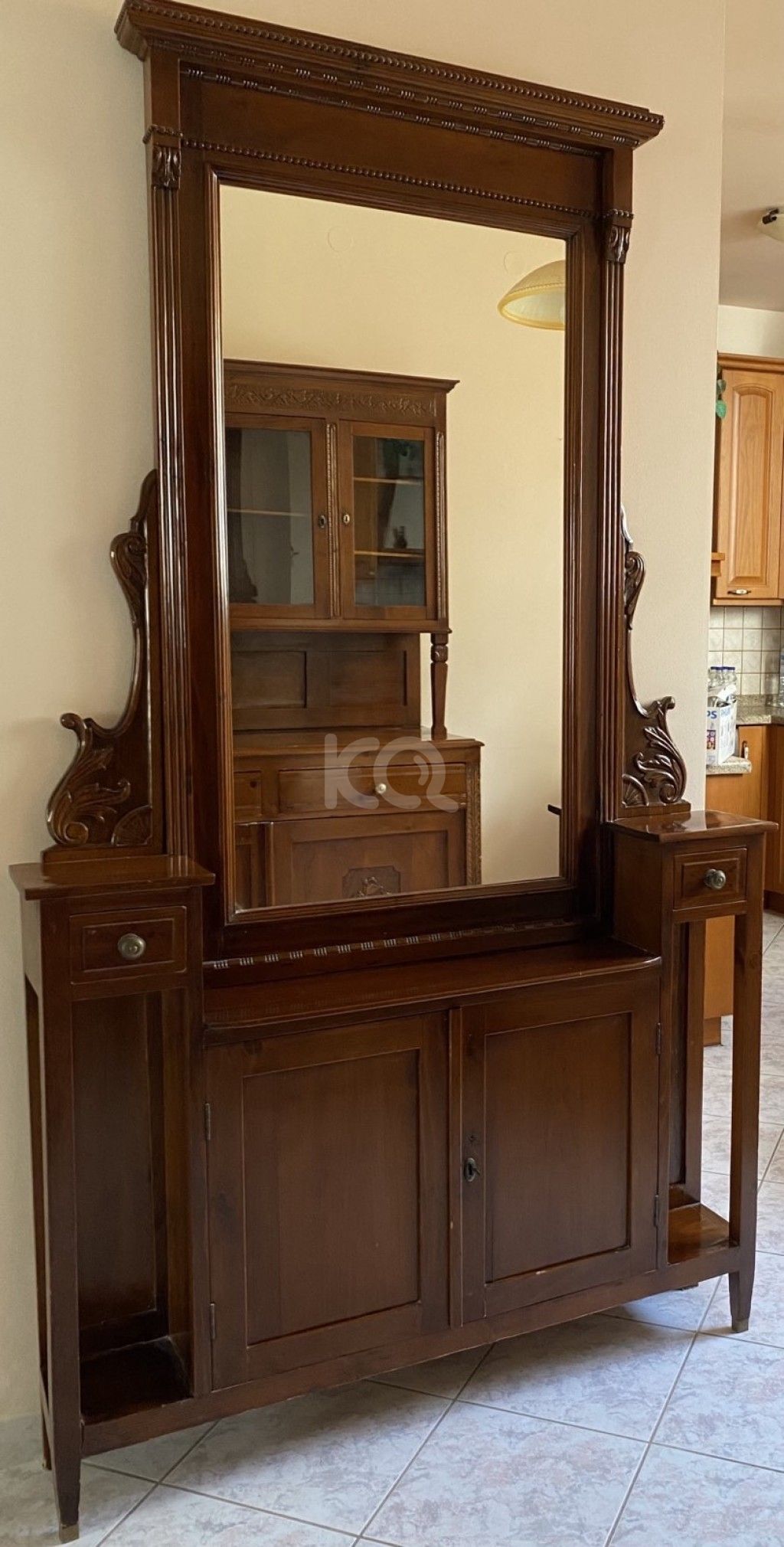 από ξύλο καρυδιάς με σκαλίσματα, 2 συρταράκια και ένα ντουλάπι. Διαστάσεις 2,15εκ ύψος Χ 0,23 πλάτος Χ 1,22 μήκος.