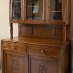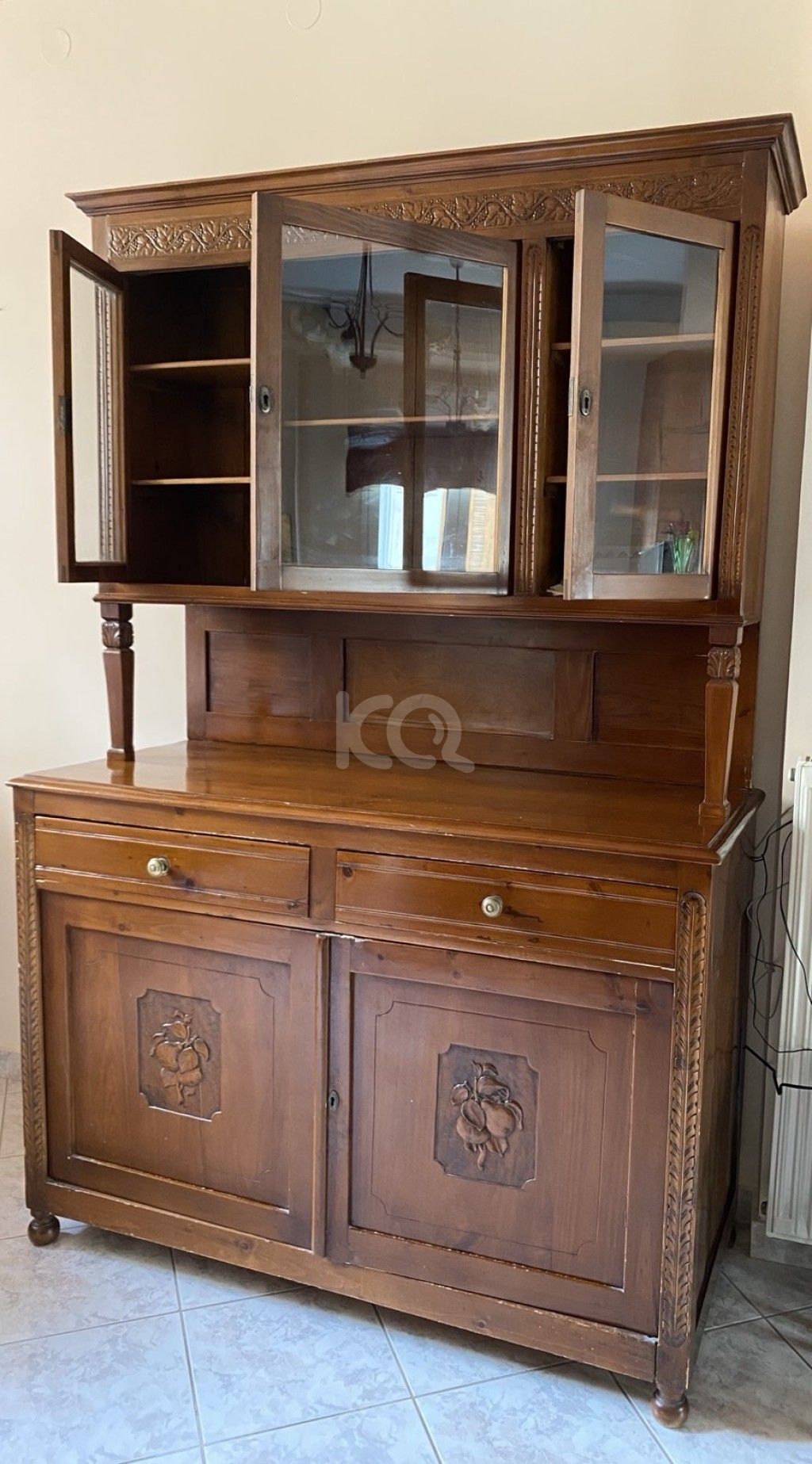 από ξύλο καρυδιάς με σκαλίσματα 2 συρτάρια, 2πορτάκια και 3 βιτρίνες. Διαστάσεις 1,33μήκος Χ 0,58 πλάτος, Χ 2,01εκ (στο πιο ψηλό σημείο).