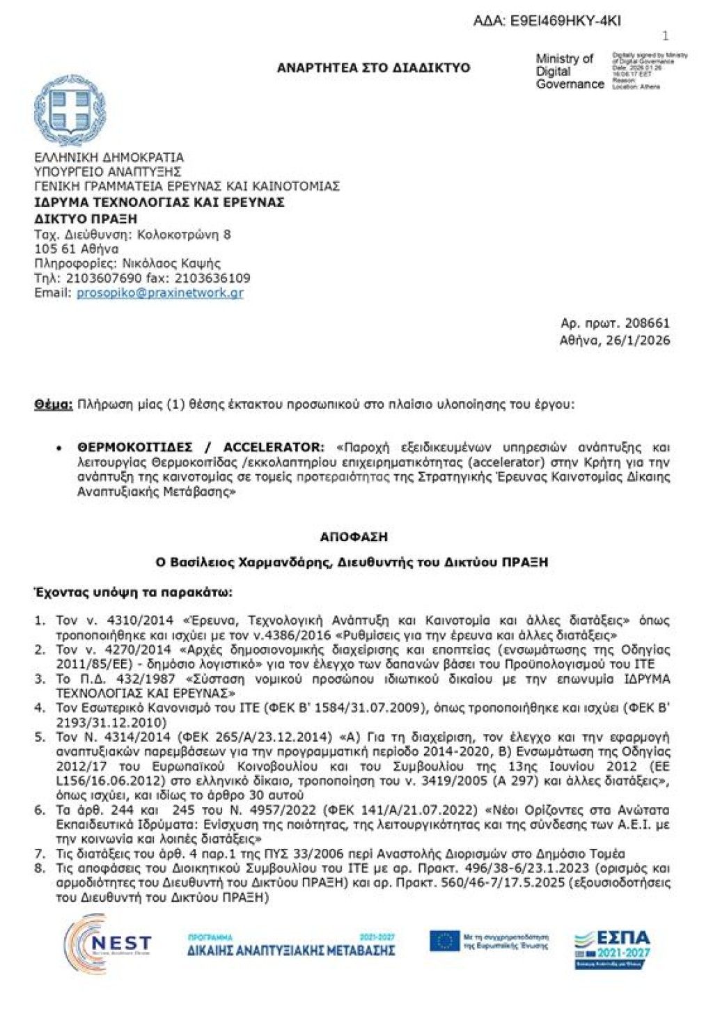 Η θέση αφορά στην υλοποίηση του έργου Θερμοκοιτίδες/ Acceleretor: «Παροχή εξειδικευμένων υπηρεσιών ανάπτυξης και λειτουργίας Θερμοκοιτίδας /εκκολαπτηρίου επιχειρηματικότητας (accelerator) στην Κρήτη για την ανάπτυξη της καινοτομίας σε τομείς προτεραιότητας της Στρατηγικής Έρευνας Καινοτομίας Δίκαιης Αναπτυξιακής Μετάβασης» στο Ηράκλειο Κρήτης.