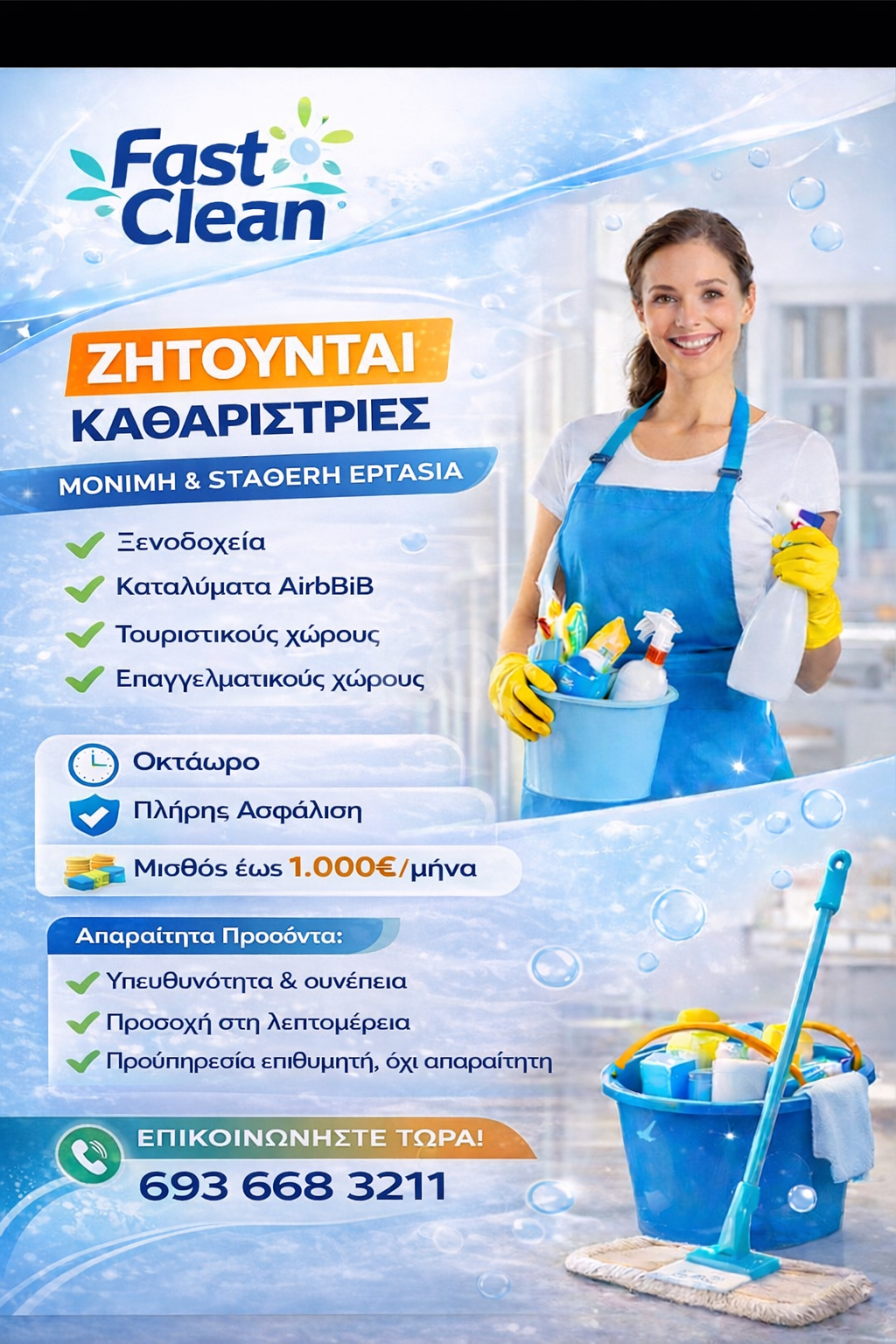 θέλεις σταθερή δουλειά στον τομέα της καθαριότητας; αναζητάμε άτομα για επαγγελματικούς χώρους για μόνιμη εργασία ή για την τουριστική σεζόν. Προϋπηρεσία επιθυμητή, όχι απαραίτητη