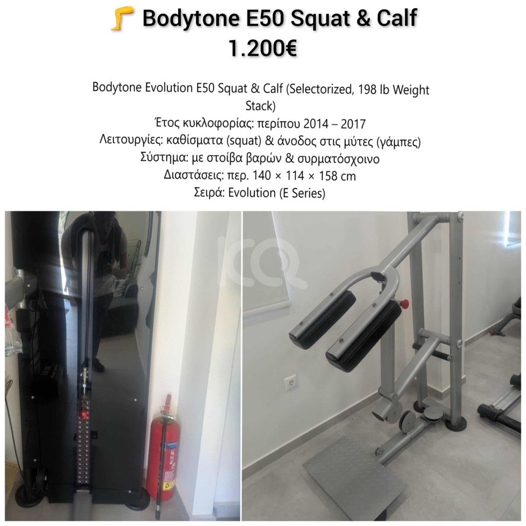 επαγγελματικό Squat & Calf Bodytone Evolution E50 με στοίβα 90kg. Πλήρως λειτουργικό, σε πολύ καλή κατάσταση. Χρησιμοποιήθηκε σε επαγγελματικό περιβάλλον με τακτική συντήρηση.