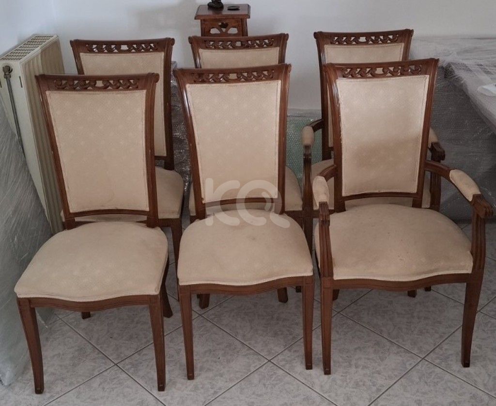 Μεταχειρισμένες καρέκλες από μασίφ ξύλο, με υφασμάτινο κάθισμα και πλάτη. Δύο από τα έξι τεμάχια έχουν και μπράτσο. Σε άριστη κατάσταση.