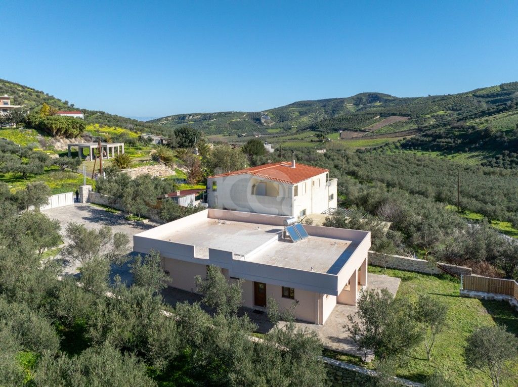 Ο εξωτερικός χώρος, περιφραγμένος με φυσική πέτρα από την περιοχή, σέβεται το περιβάλλον και εναρμονίζεται με το τοπίο. Τα ελαιόδεντρα, η διαμορφωμένη επίστρωση από κυβόλιθους και ο μεγάλος χώρος προσφέρουν την ιδανική δυνατότητα για κατασκευή πισίνας ή κήπου, ενώ η θέα στο καταπράσινο τοπίο και τους λόφους δημιουργεί ένα μοναδικό σκηνικό γαλήνης και ηρεμίας.