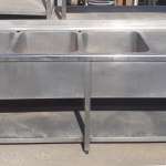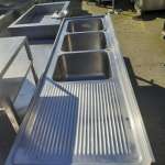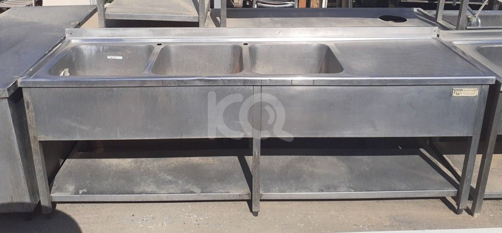 Μεταχειρισμένη λάντζα τριπλή inox, με τρεις γούρνες και επιφάνεια αποστράγγισης. Με κάτω ράφι για αποθήκευση. Σε καλή κατάσταση. Διαστάσεις: 240x70x92 εκ. Η τιμή δεν περιλαμβάνει μεταφορικά